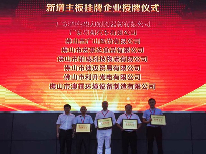| 2016年9月1日下午,佛山市利升光电有限公司董事长兼总经理王清平先生、财务总监谭新文先生、总经理助理梁晴女士、项目经理黄艳清女士等公司高管及辅导机构、券商、律师代表参加了广东金融高新区股权交易中心举行的企业融资对接会暨新增企业挂牌仪式。